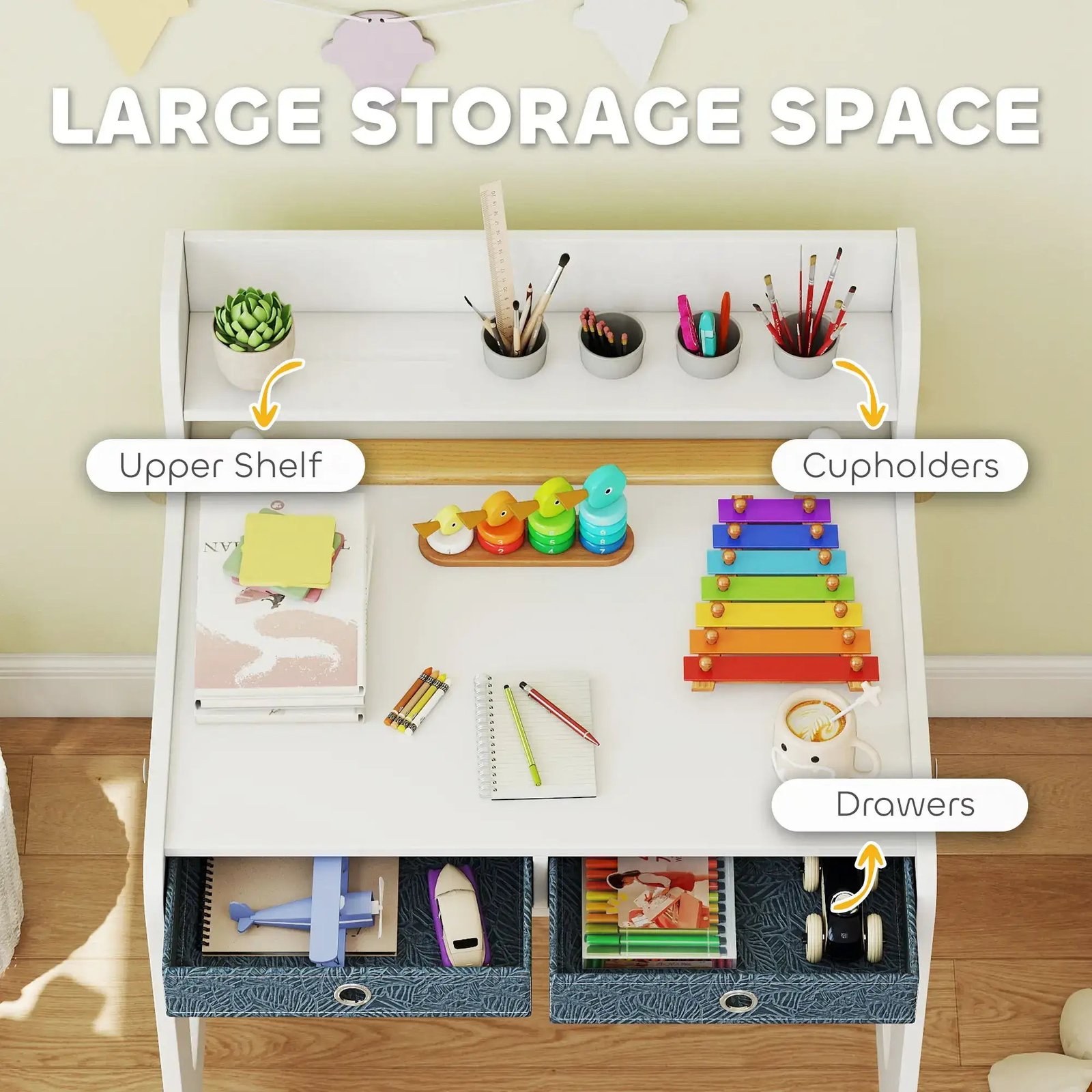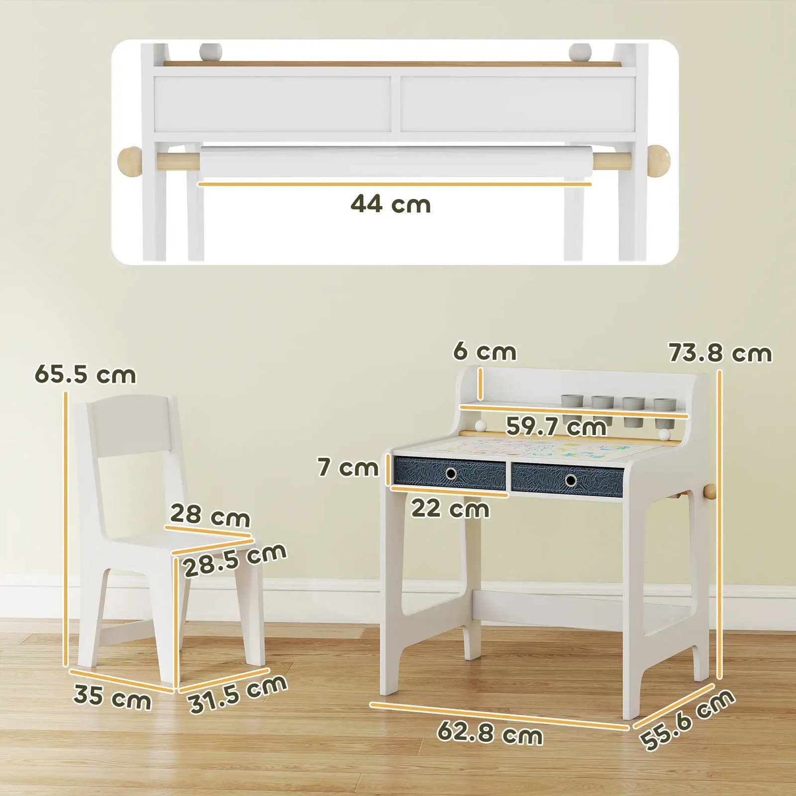 Designed with young learners and little artists in mind, this two-piece set includes a spacious desk and matching chair. The desk features a raised shelf, two pull-out drawers and four built-in cupholders, making it easy to store books, stationery and art supplies while encouraging tidy habits. A built-in paper roll holder keeps paper steady for drawing, painting and crafting, creating a perfect spot for creativity.