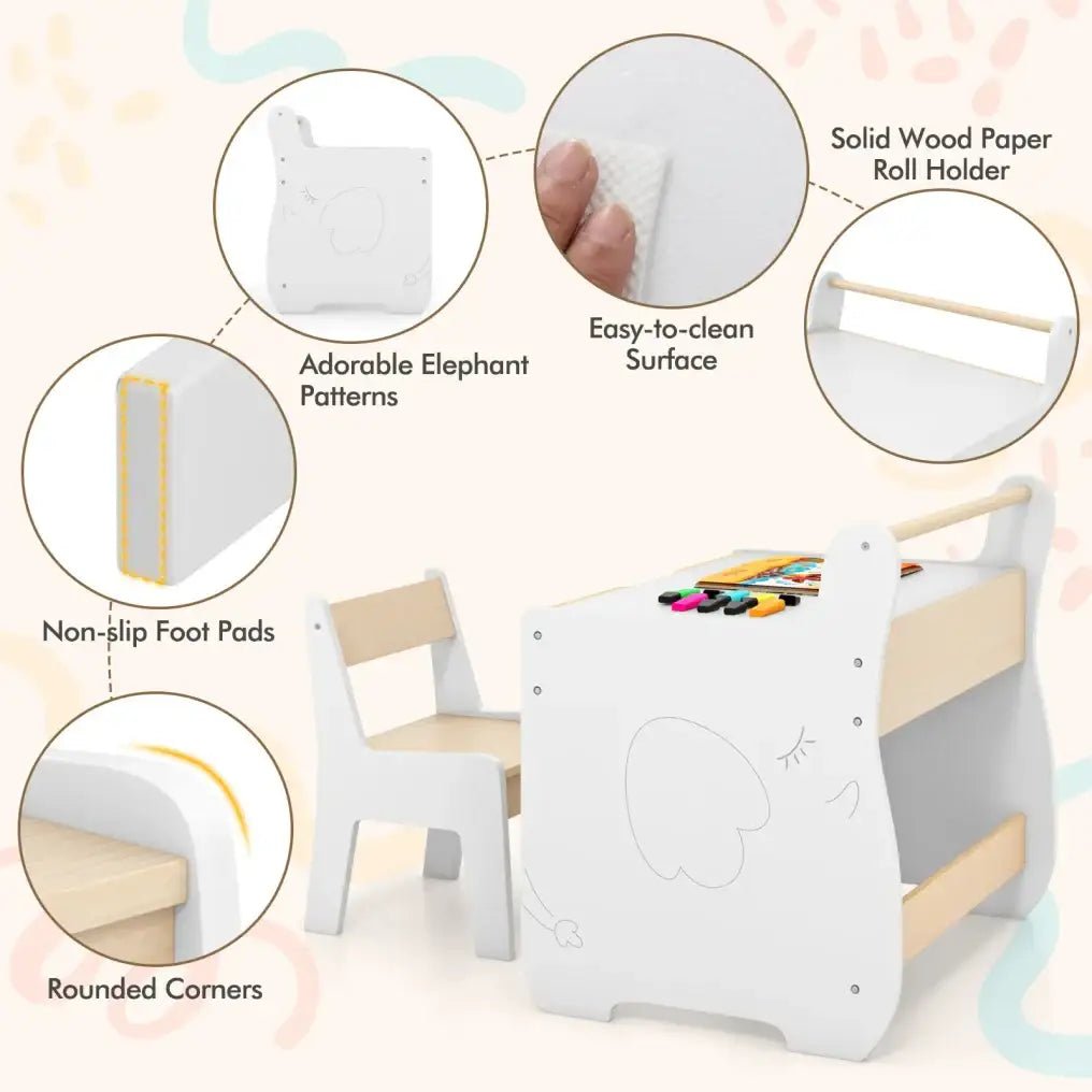 Featuring a detachable tabletop that flips between a chalkboard and whiteboard, this multifunctional set adapts to drawing, writing, learning and imaginative play. The integrated paper roll holder allows continuous creative activities, while built-in storage under the table keeps books, toys and stationery neatly organised and easily accessible.
