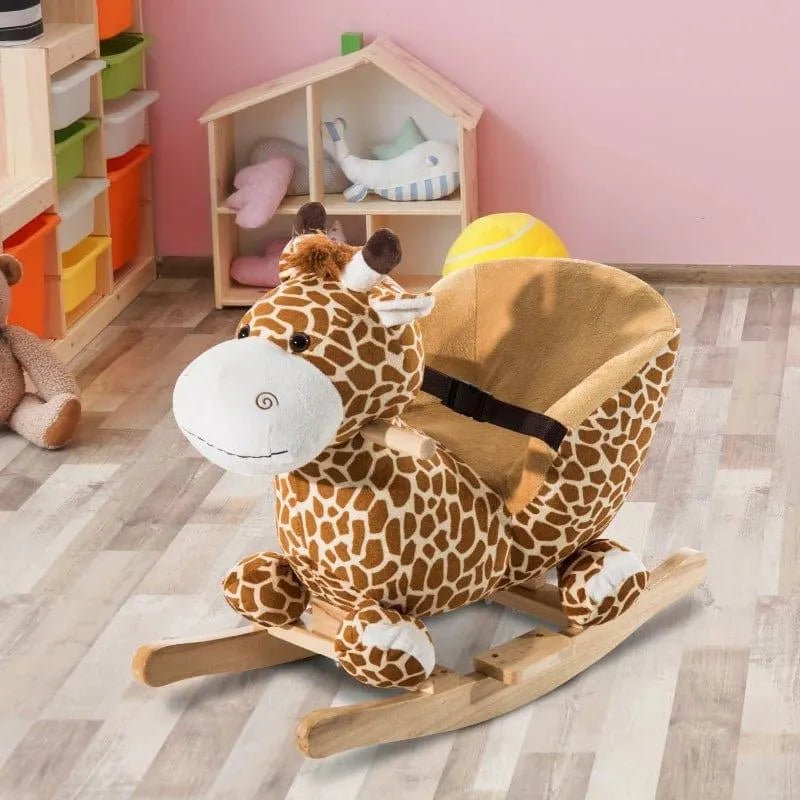 HOMCOM baby rocker giraffe yellow | Plush rocking toy with horn-press nursery rhymes, compact design and sturdy wood base for toddlers aged 18 months+