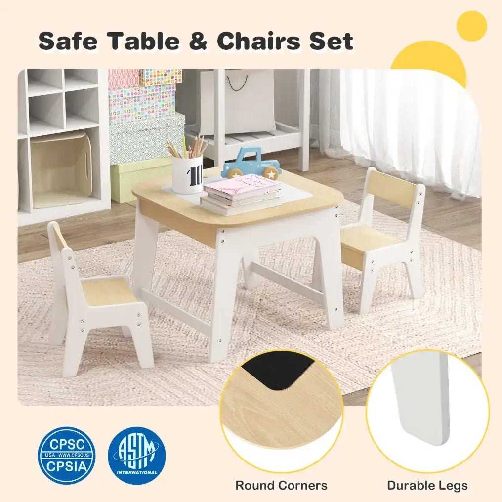 Made from durable MDF with burr-free edges and rounded corners, this table and two-chair set ensures safety and stability during daily use. Ergonomic backrests provide posture support while sturdy legs keep the structure stable. With ASTM and CPSIA certifications, parents can enjoy peace of mind knowing it meets strict safety standards.