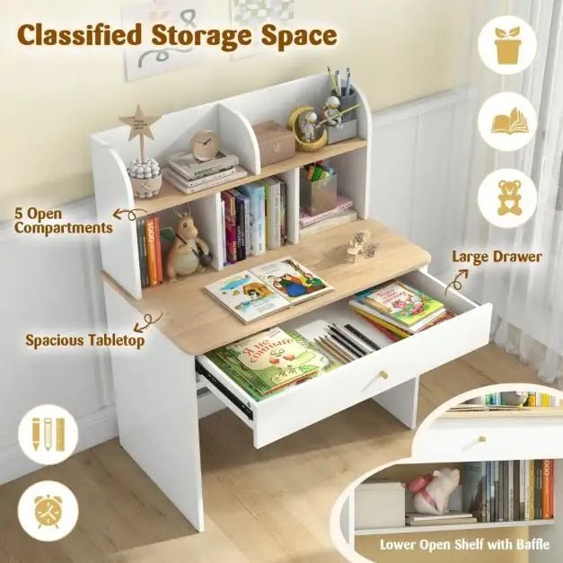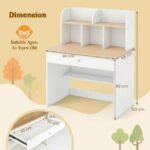 Costway kids study desk | Wooden desk with drawer, 5 hutches and storage shelf for learning, drawing and play | White finish