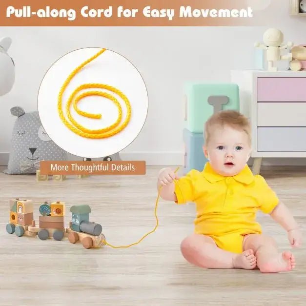 Wooden Train Set with Blocks | Educational Pull-Along Toy for Toddlers COSTWAY