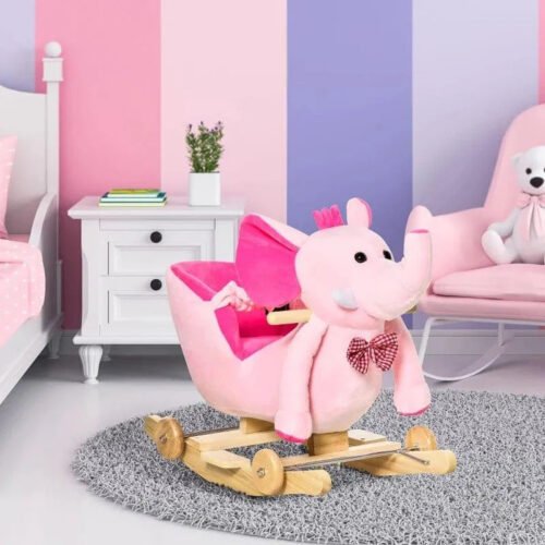 2-in-1 Rocking Horse Elephant – Pink Plush | Stroller Conversion and 32 Nursery Rhymes HOMCOM